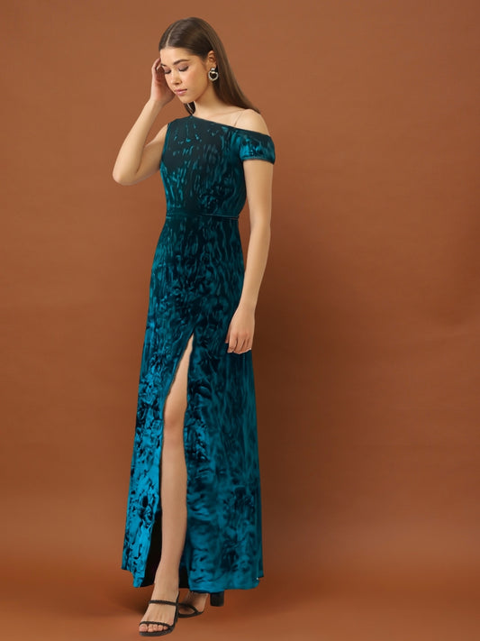 Teal Blue Velvet One Shoulder Maxi Dress – Elegant Evening Party Gown with Slit
