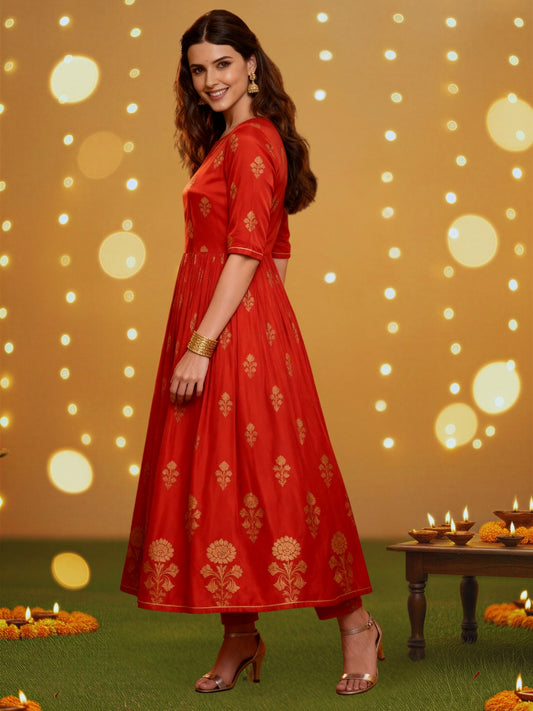 Red Anarkali Kurta Pant Coord Set for Women , Festive Ethnic Wear , Gold Print Partywear Dress
