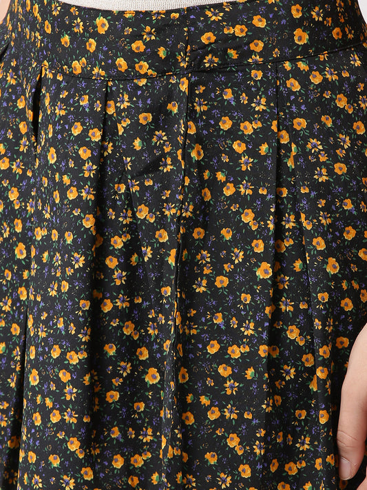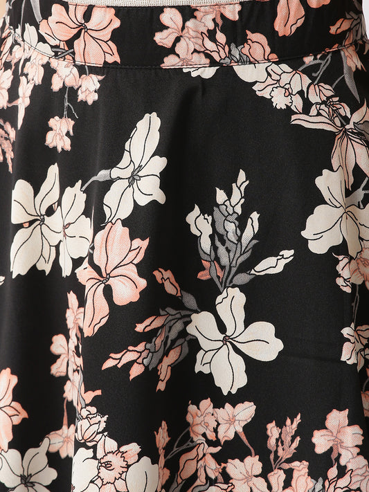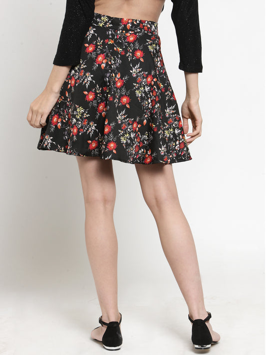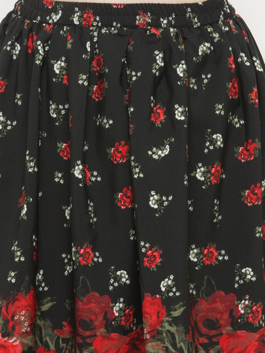 Black & Red Floral Printed Flared Skirt