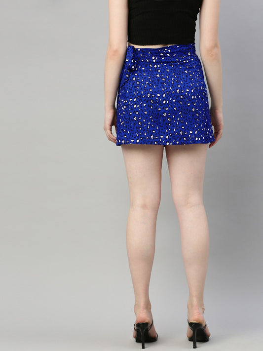 Blue & Black Animal Printed Wrap Mini Skirt with Tie-up