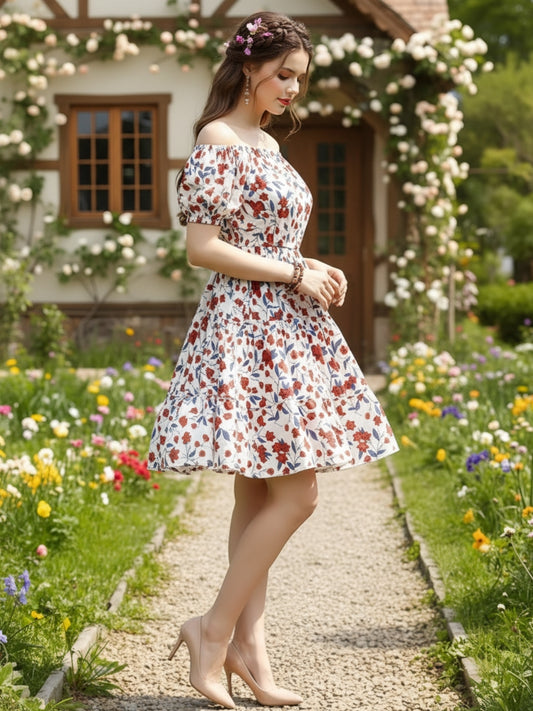 Boho Off-Shoulder Maxi Dress for Women – Red Printed Beach Vacation Long Dress