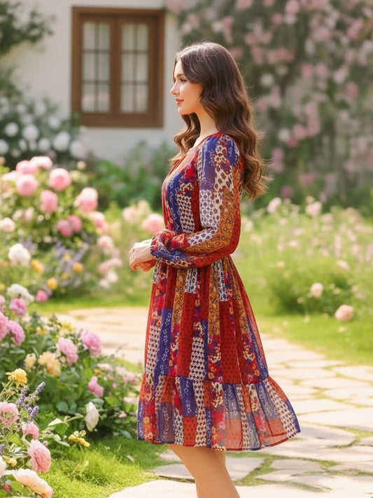 Sera Printed Round Neck Fit and Flare Long Sleeves Knee Length Dresses