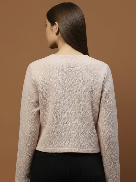 Beige Textured Button-Up Jacket for Women Stylish Cropped Jacket