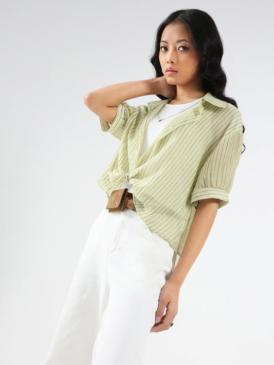 Light Green Striped Oversized Top with inner tank top and necklace