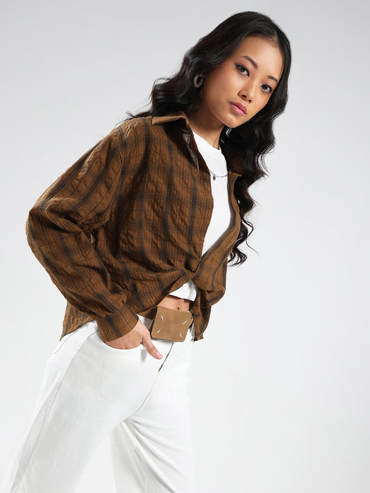 Brown Checkered Oversized Shirt with tank top and necklace
