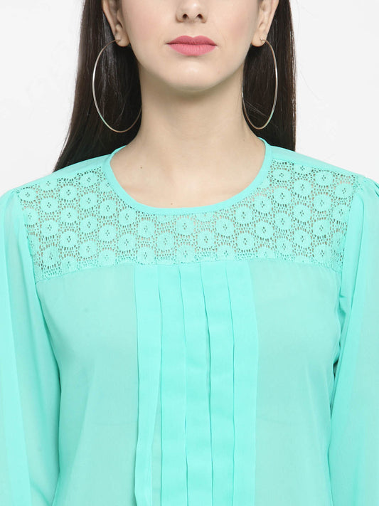 Green Front Pleated Lace Yolk Top