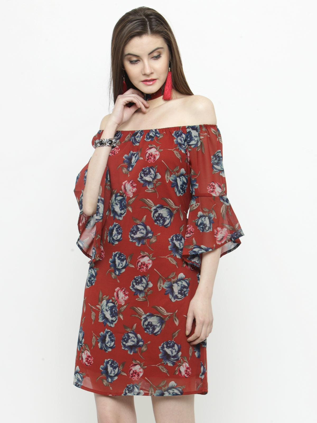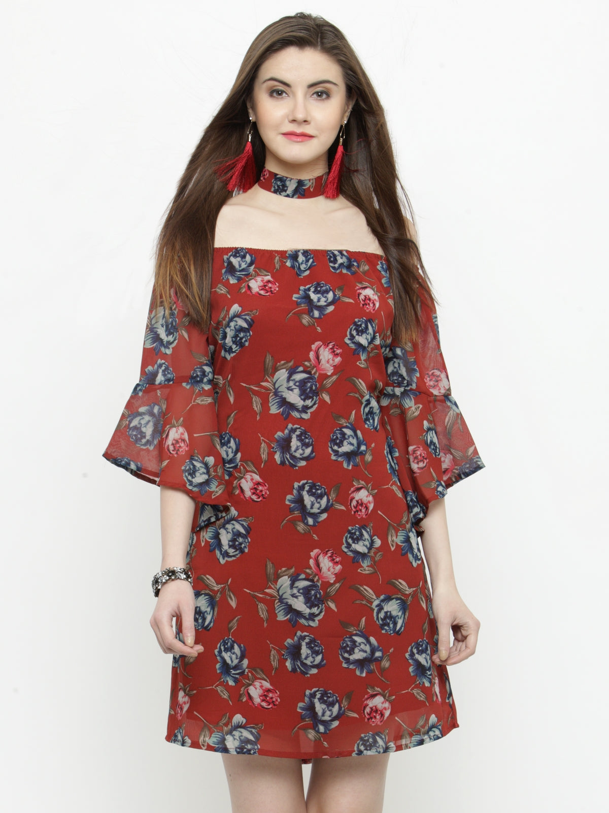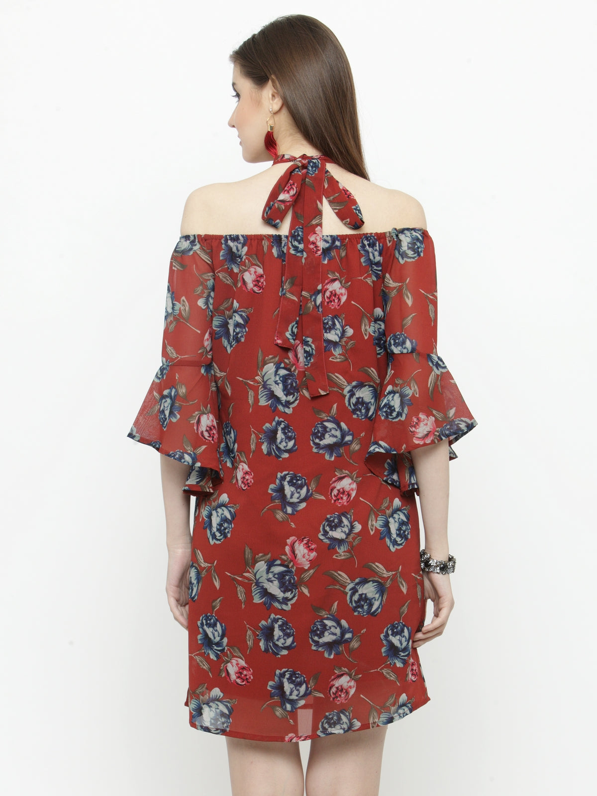 Red printed woven A-line dress, has a halter neck, three-quarter sleeves,an attached lining, curved hem