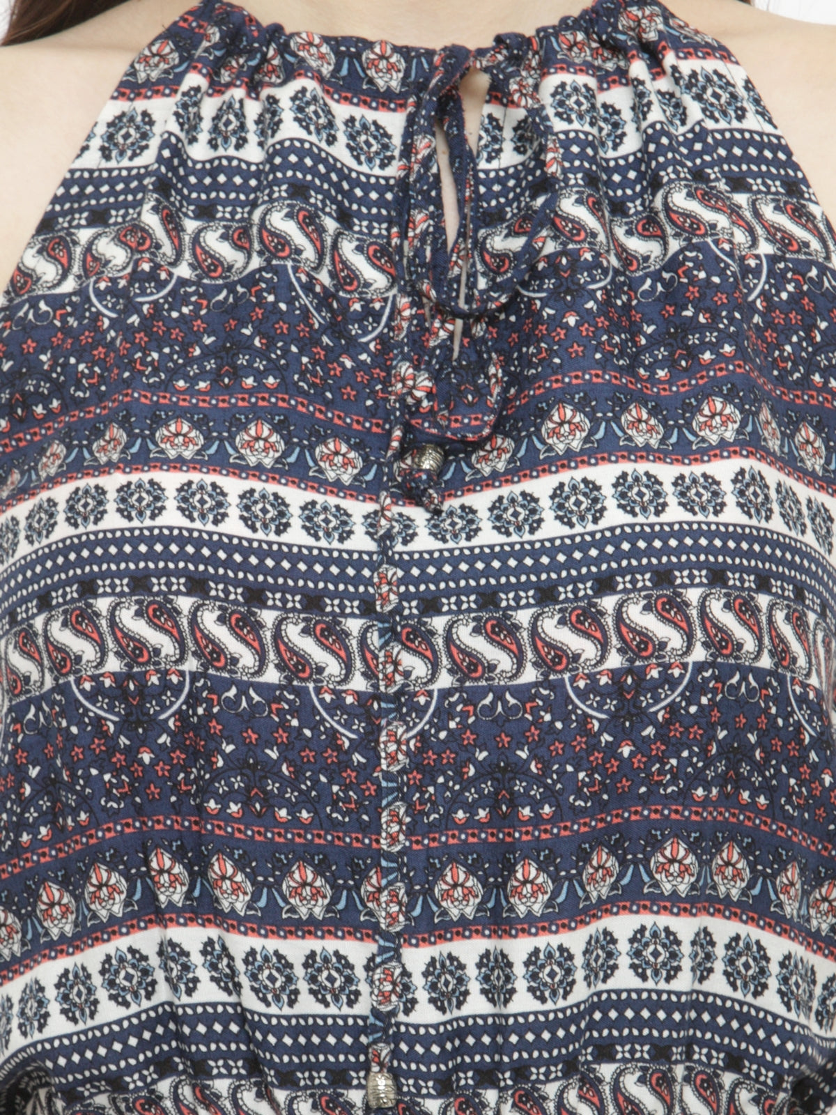 Blue printed playsuit, has a round neck with a tie-up detail, sleeveless