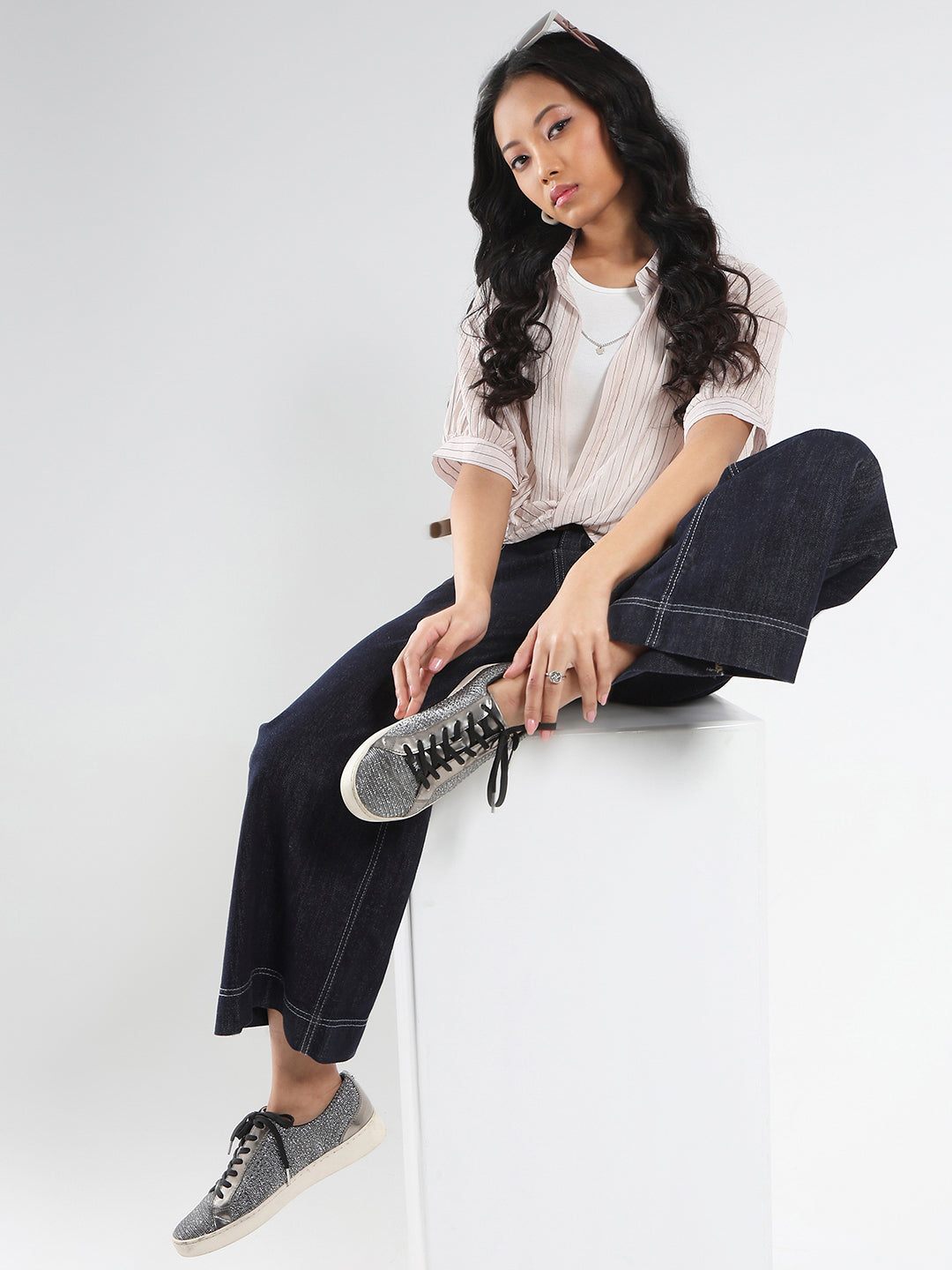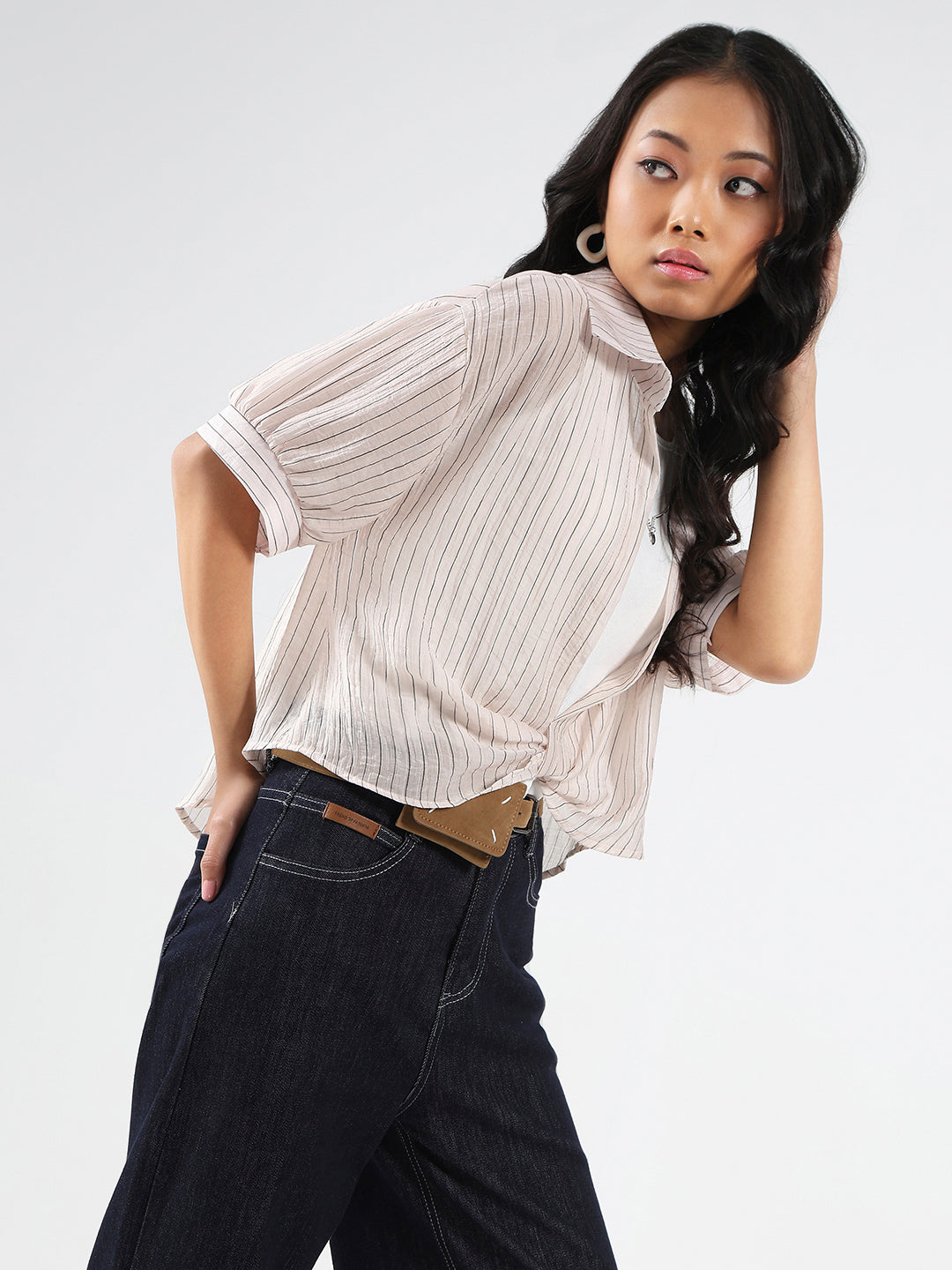 The ultimate off-duty model look is here! This blush-toned oversized shirt with pinstripe detailing and subtle studded accents gives you the perfect blend of effortless sophistication and casual cool.