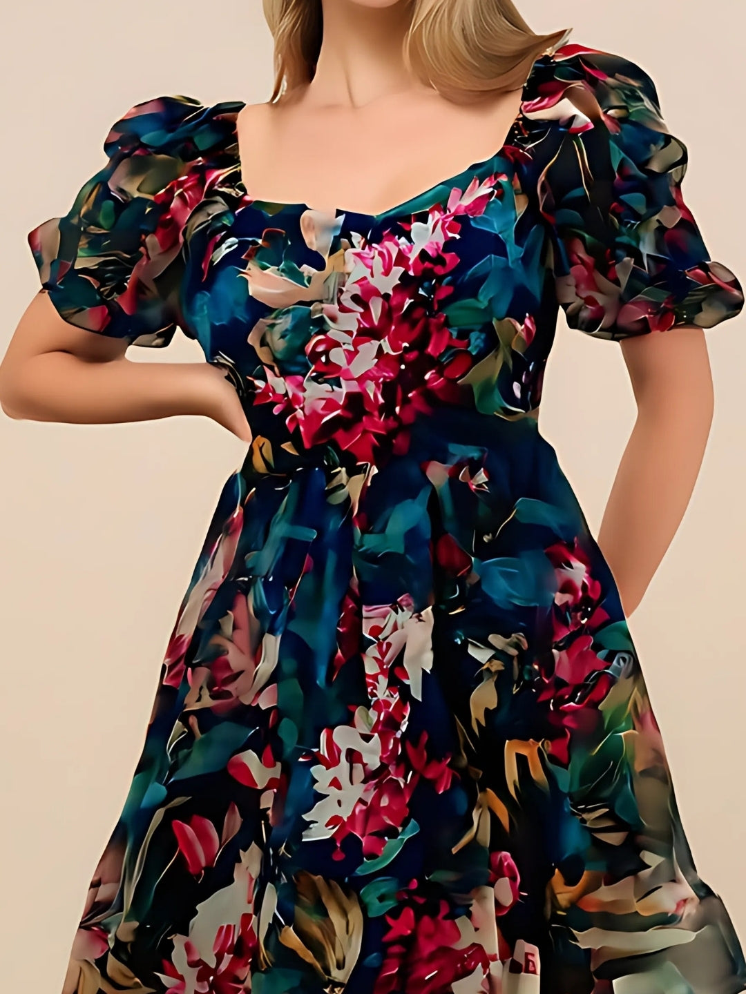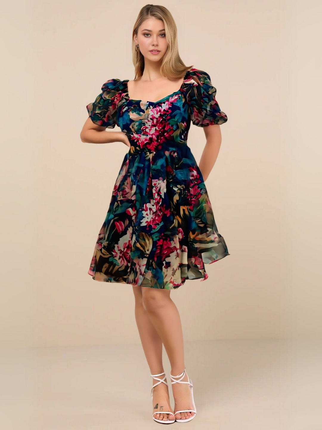 Floral Drama Puff Sleeve Organza Statement Style Mini Dress