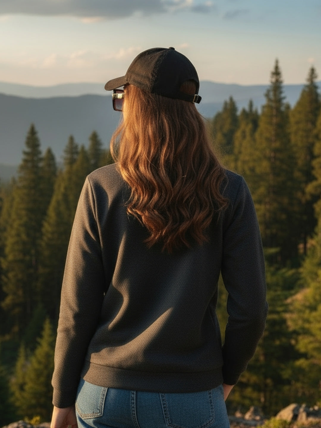 Charcoal grey and white printed sweatshirt, has a round neck, straight hem