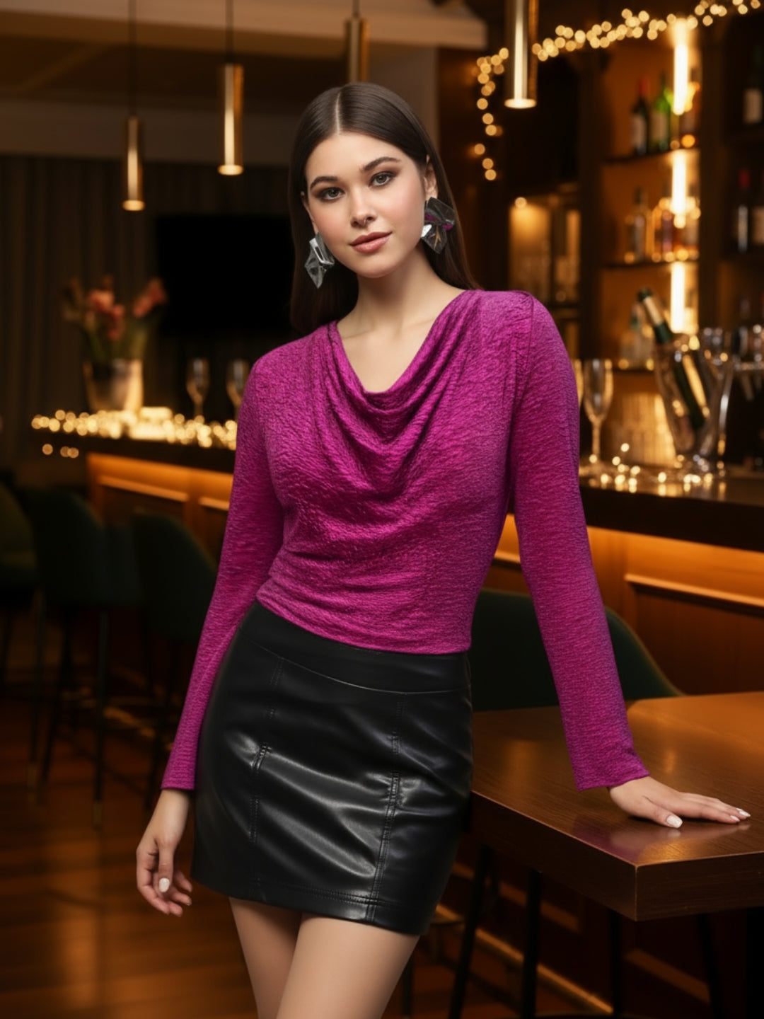 Shine bright with this Fushia Foil top for women, featuring a deep V-neckline, long sheer sleeves, and a dazzling Foil finish for a glamorous party look. Perfect as a stylish party wear blouse, this top combines elegance and sparkle, making it ideal for night outs, clubs, and festive occasions. Crafted with premium quality fabric, this women’s shimmer top offers both comfort and style. Pair it with skirts, trousers, or jeans to create a chic, head-turning outfit. A must-have Fushia Foil blouse to elevate your evening wardrobe.